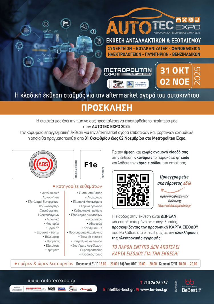 O Πανελλήνιος Σύνδεσμος Ιδιοκτητών Συνεργείων Επισκευής Φρένων Αυτοκινήτων έχει την τιμή να σας προσκαλέσει να επισκεφθείτε το περίπτερο του F1e στην έκθεση “AUTOTEC EXPO 2025’’, που θα πραγματοποιηθεί από τις 31 Οκτωβρίου έως τις 2 Νοεμβρίου στο εκθεσιακό κέντρο Metropolitan Expo .